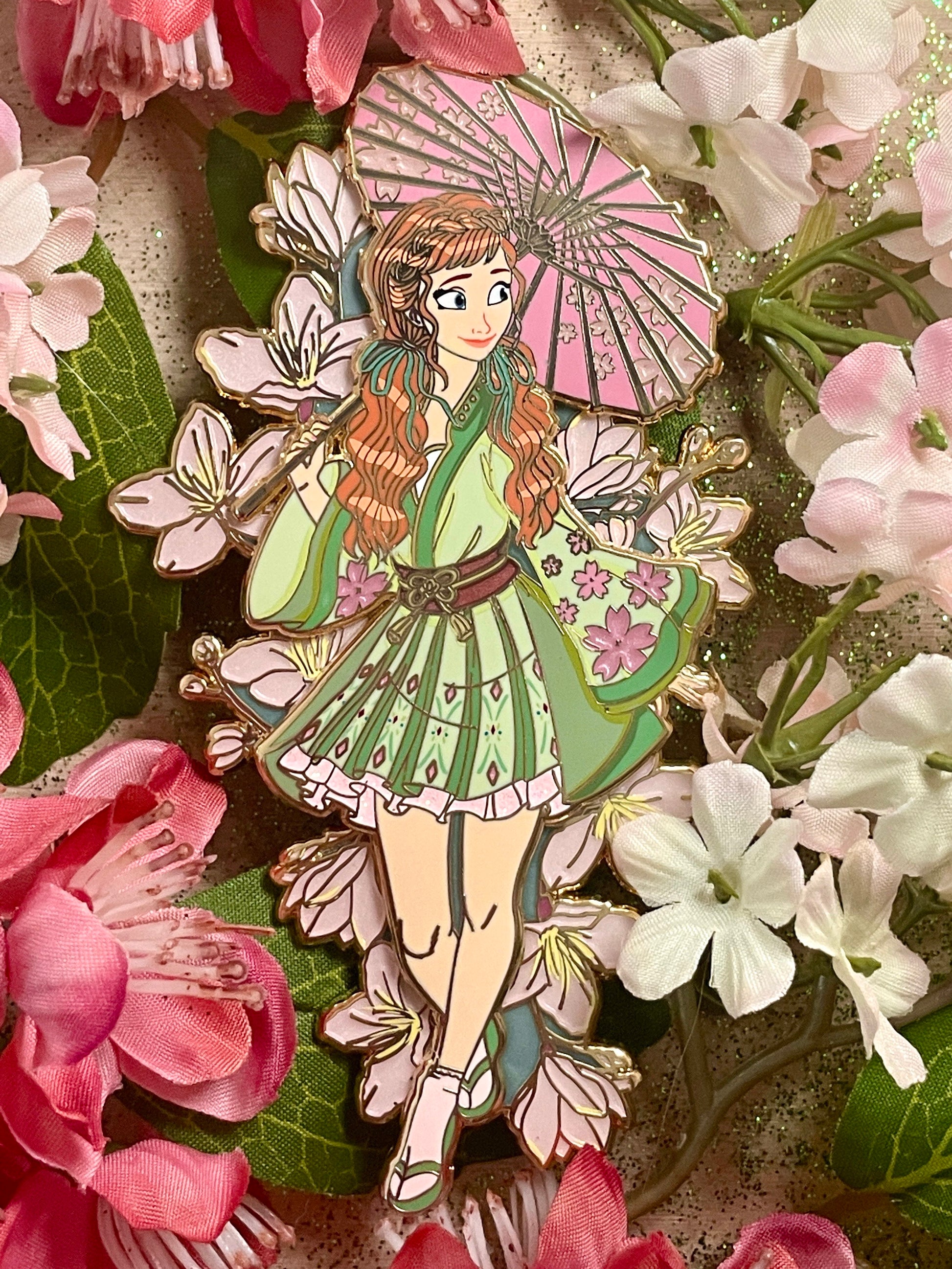 Background has pearlescent flowers and sandblast sky. Anna has a sandblast obi, pearlescent flower details and glitter underskirt.