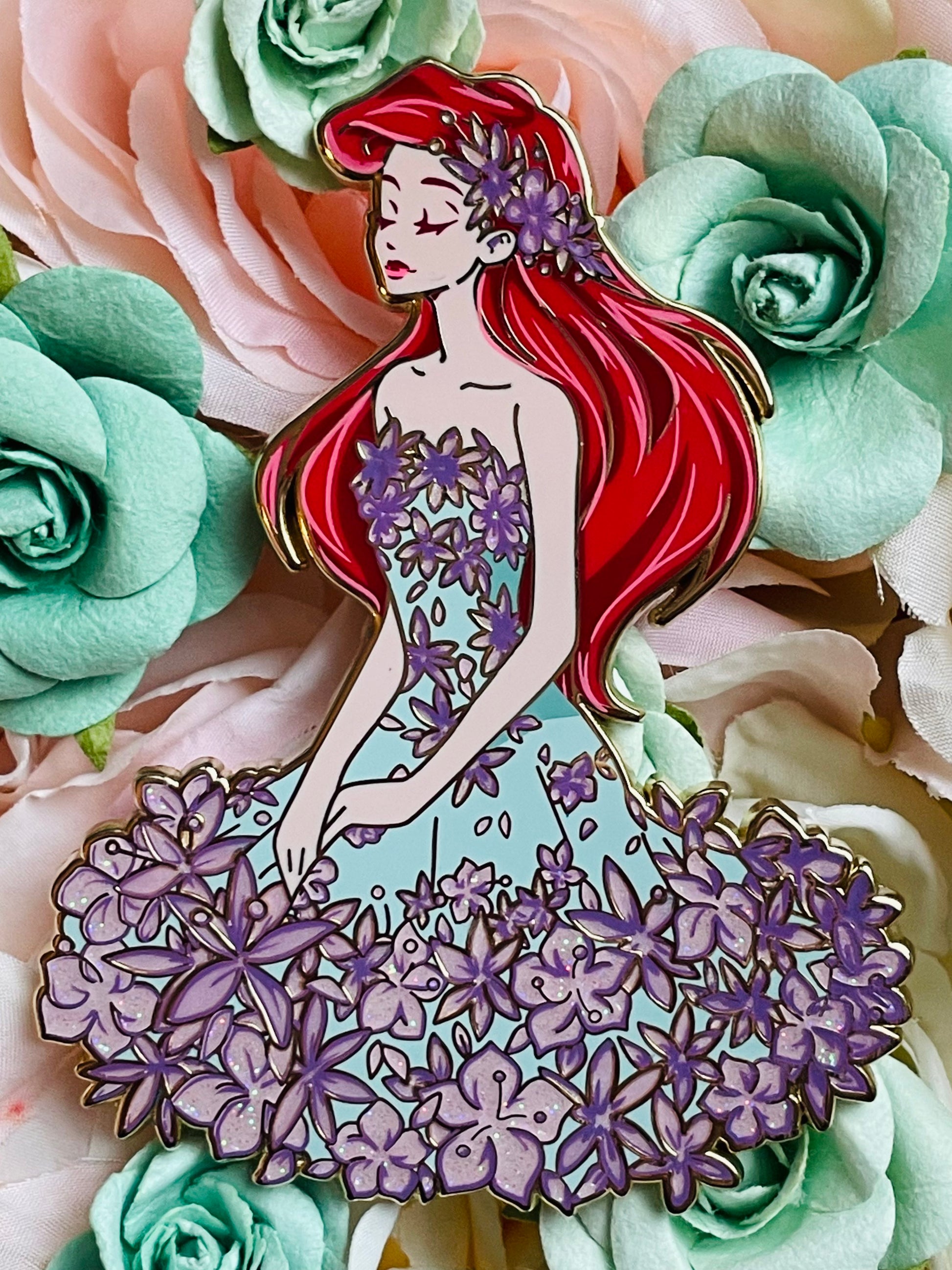 Dress shoulders and pink flowers are pearlescent, while purple flowers are glitter.