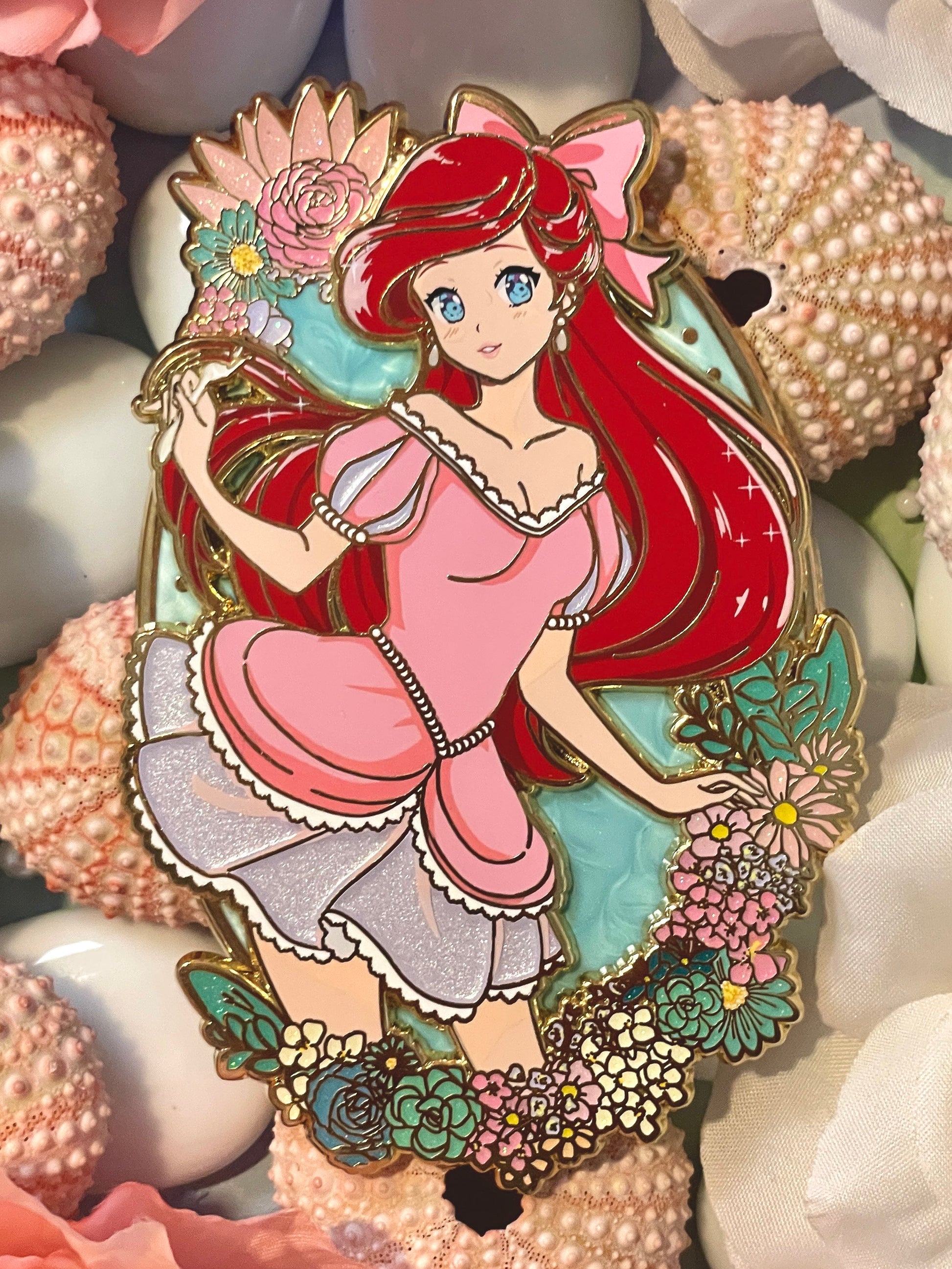 The backpin is swirled Pearl with glitter flowers. Ariels dress has white pearlescent.