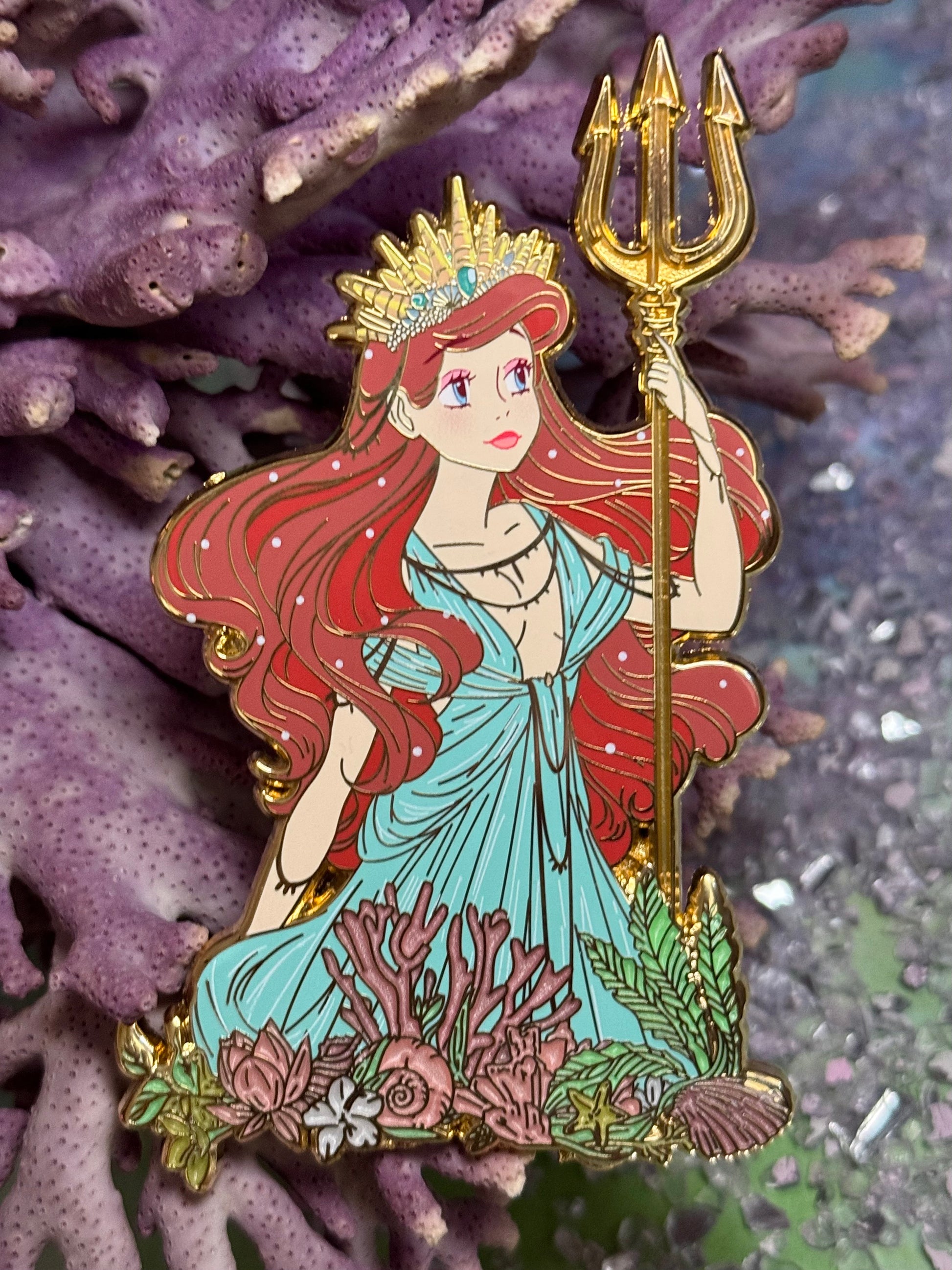 Ariel is holding a sandblast trident and is bordered by pearlescent coral and flowers. Her tiara stone is glitter and she’s finished off with gradient blush.