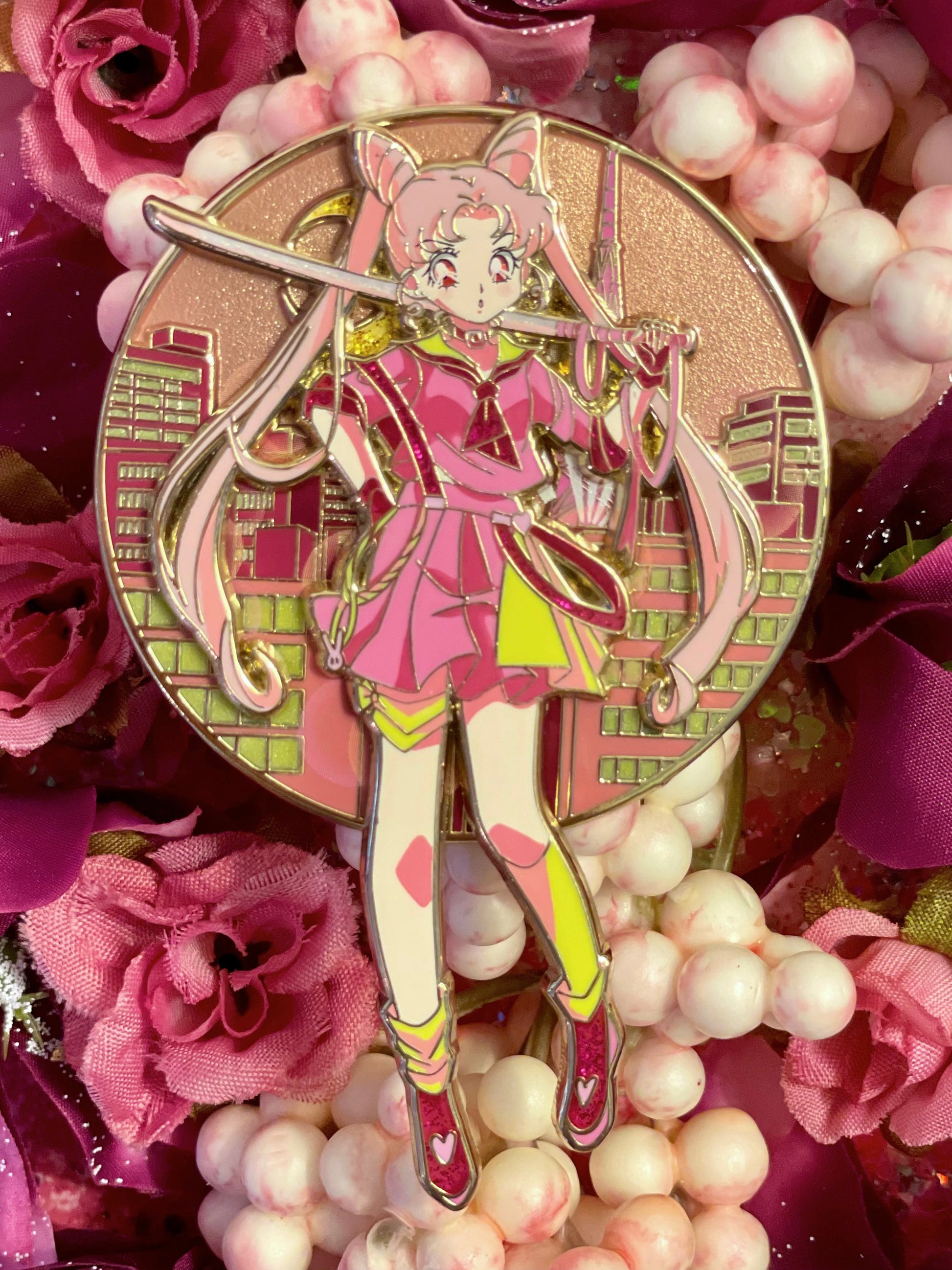 Chibi has a pearlescent sword, pink glitter accessories, and gradient blush.