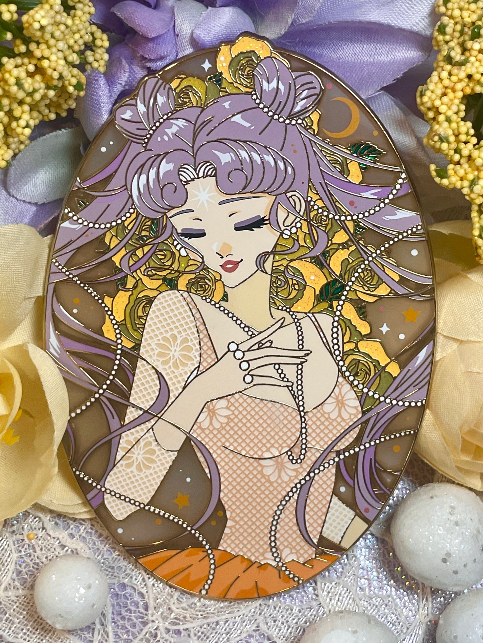 4" with gold plating and custom backstamp. Stained glass background, glitter roses, transparent sandblast leaves, pearlescent sleeves and shirt.