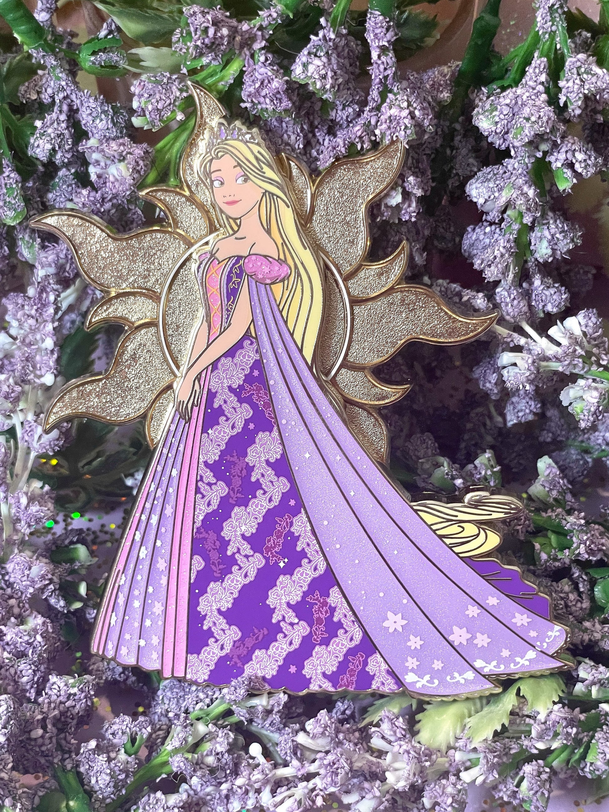 The Corona kingdom sun is recessed sandblast metal and Rapunzel has both pearlescent and glitter dress details.