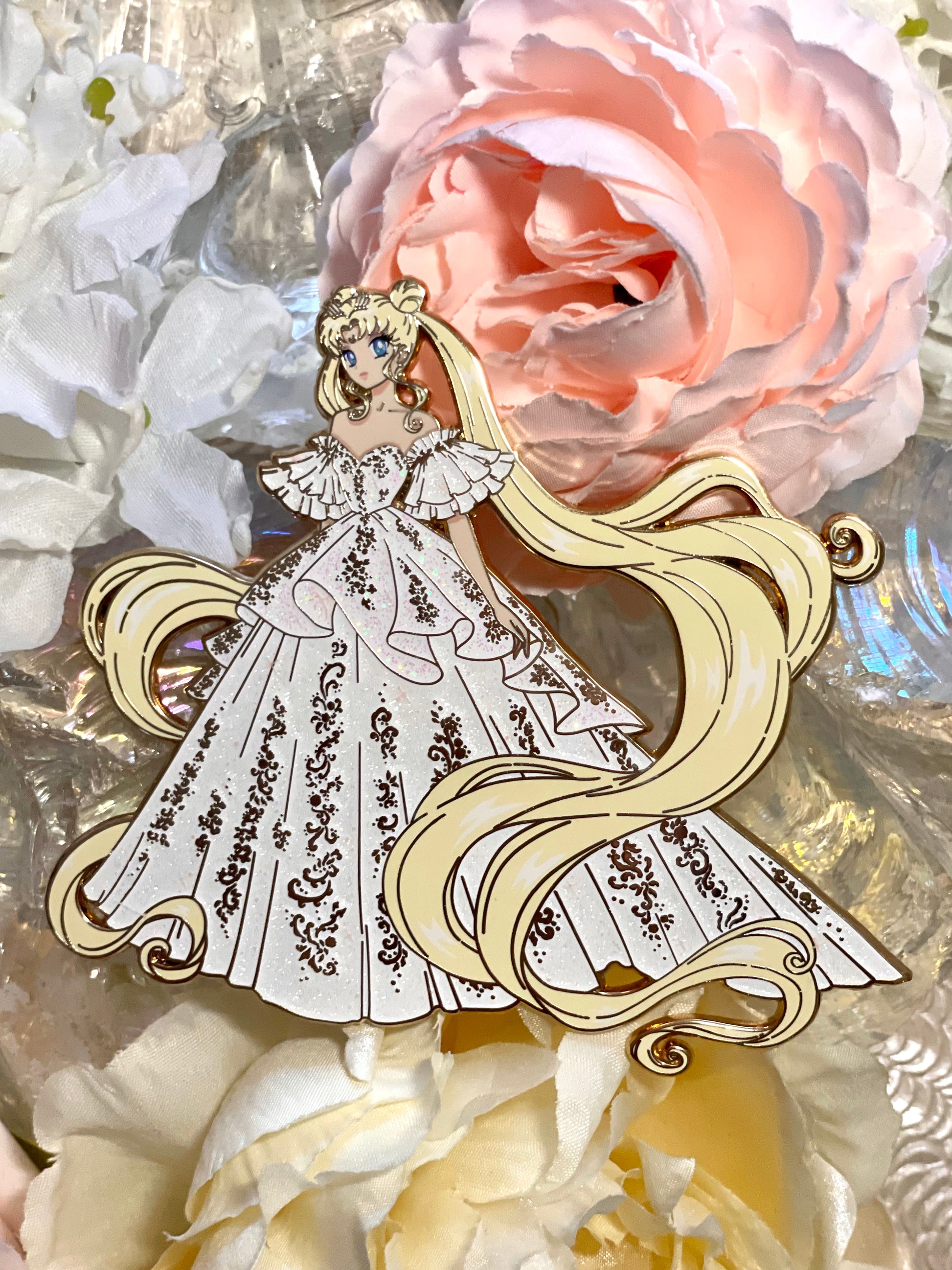 Serenity has a mixture of pearlescent and glitter for her dress with raised metal details.