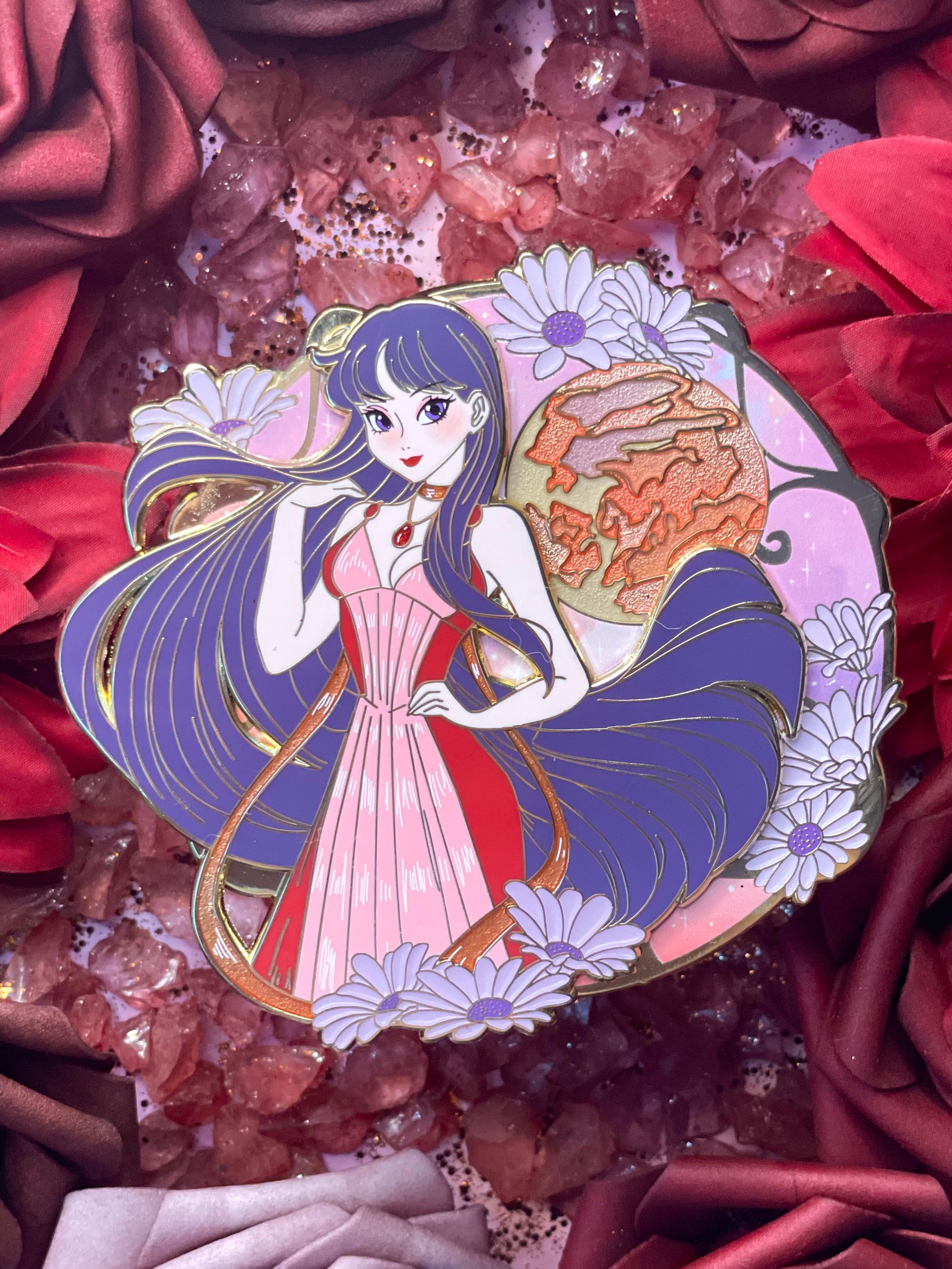 Back pin has a transparent sandblast planet, pearlescent flowers and full print sky. Mars has gradient blush, pearlescent flowers, and sandblast ribbons