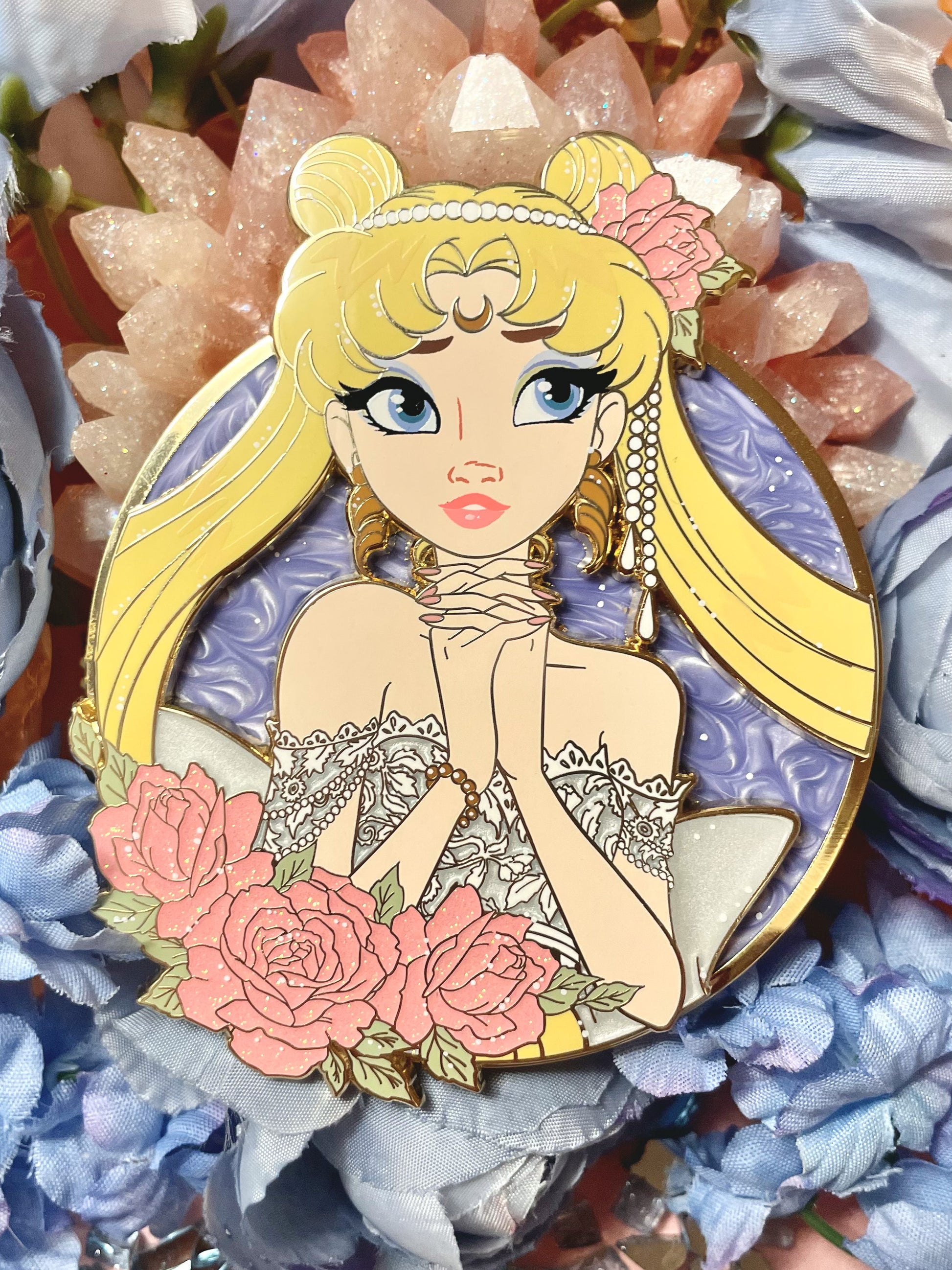 Moon has a swirled pearl backpin, glitter flowers, and pearlescent dress details.
