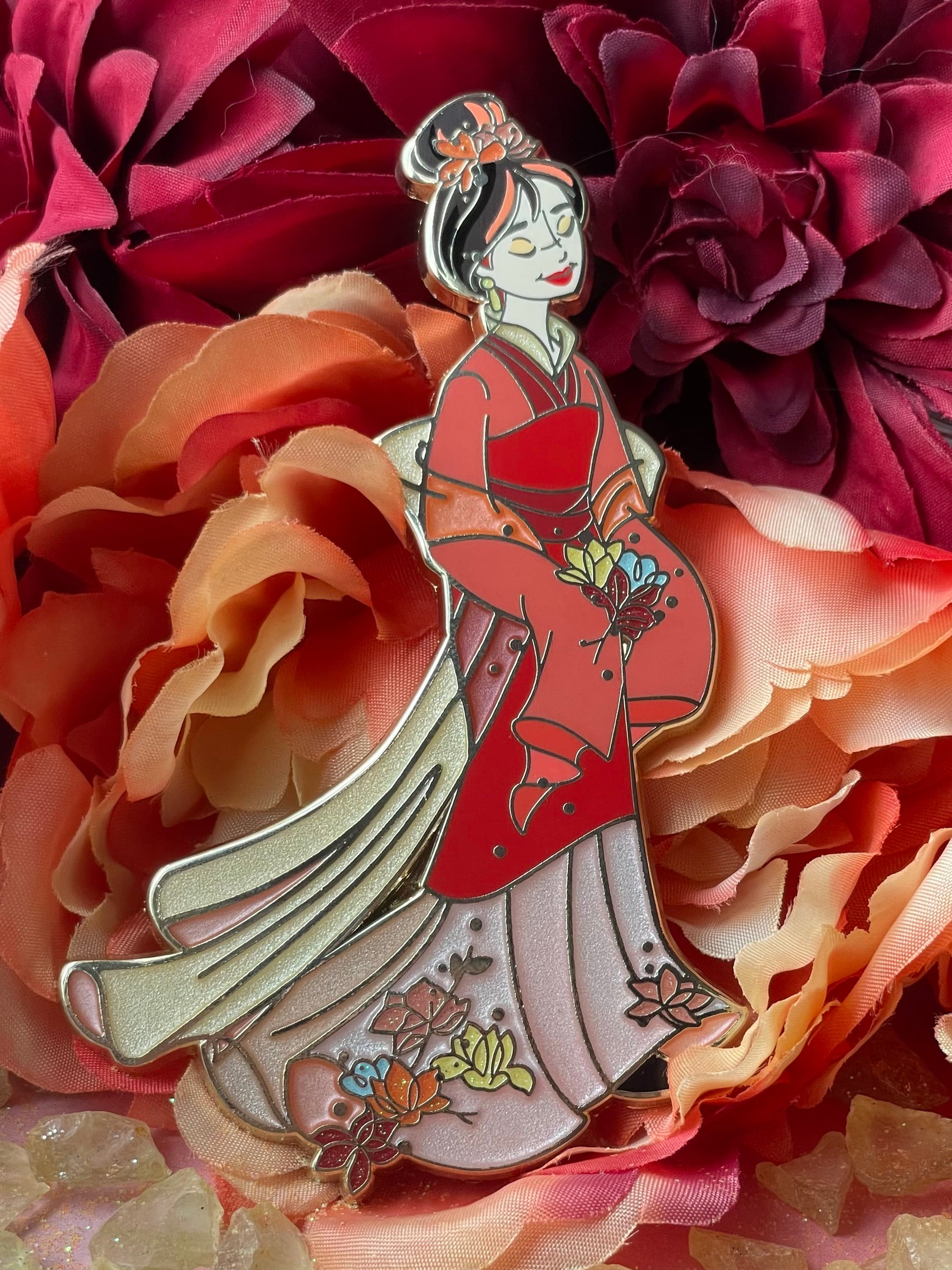 4" pin with pearlescent underskirt and shawl, and glitter flowers