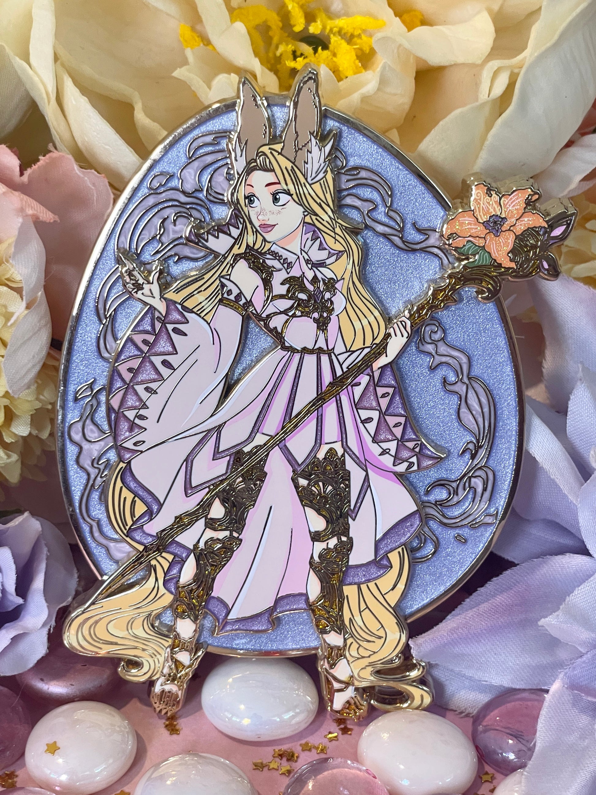 The back pin is pearlescent with swirled pearl "magic". Rapunzel has
