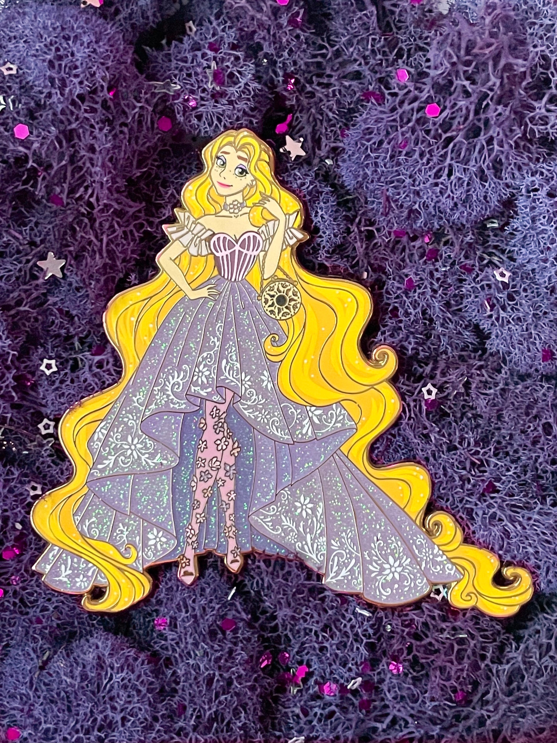 Glitter skirt, sandblast corset, pearlescent sleeves and flowers, and raised metal purse.