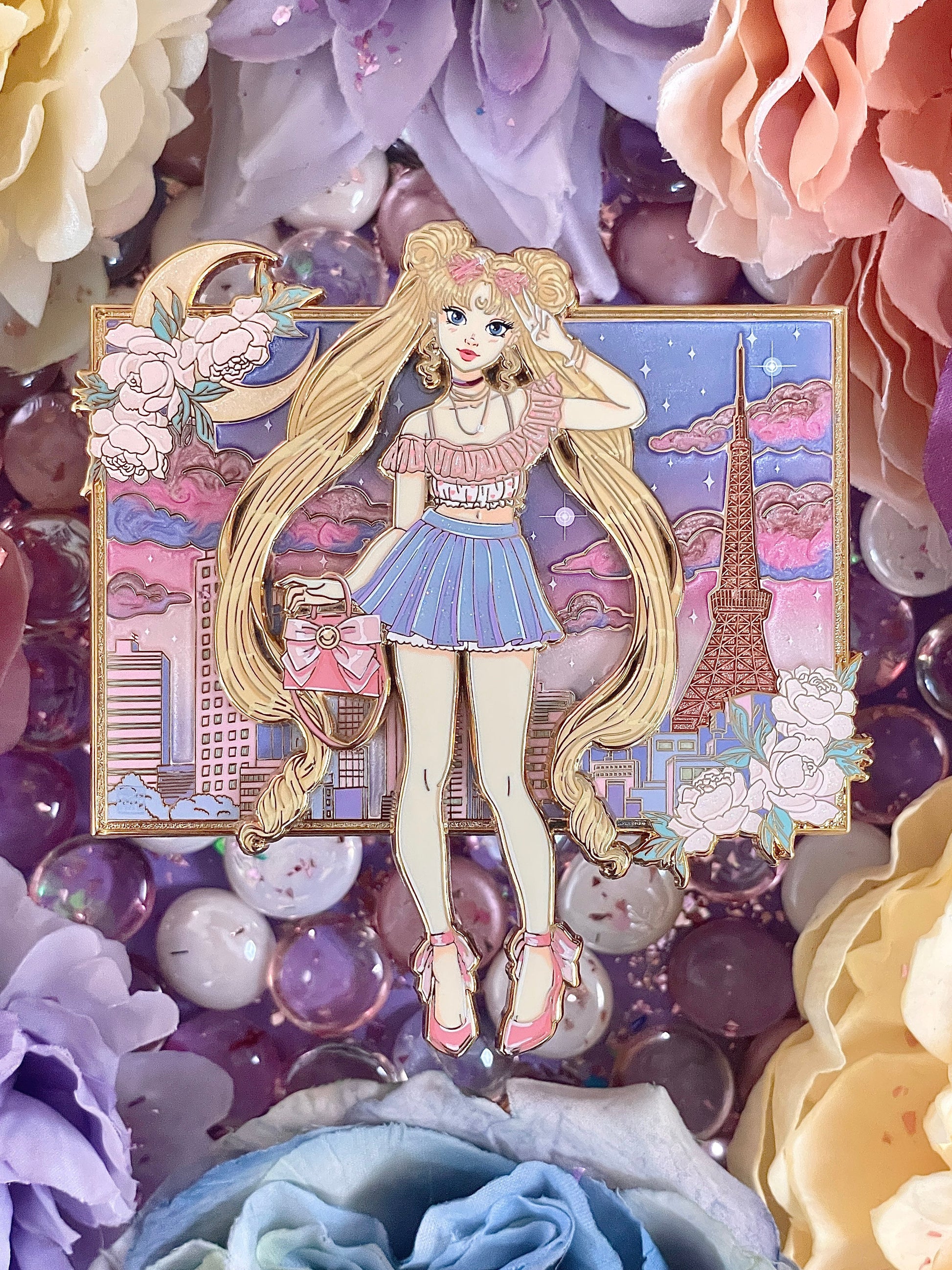 This pin was designed as a postcard concept with Sailor Moon/Usagi sending you a card from her hometown of tokyo! This pin has a special backstamp designed by Mery! It is a stamp of sailor moon and is signed "With love from Tokyo - Usagi".