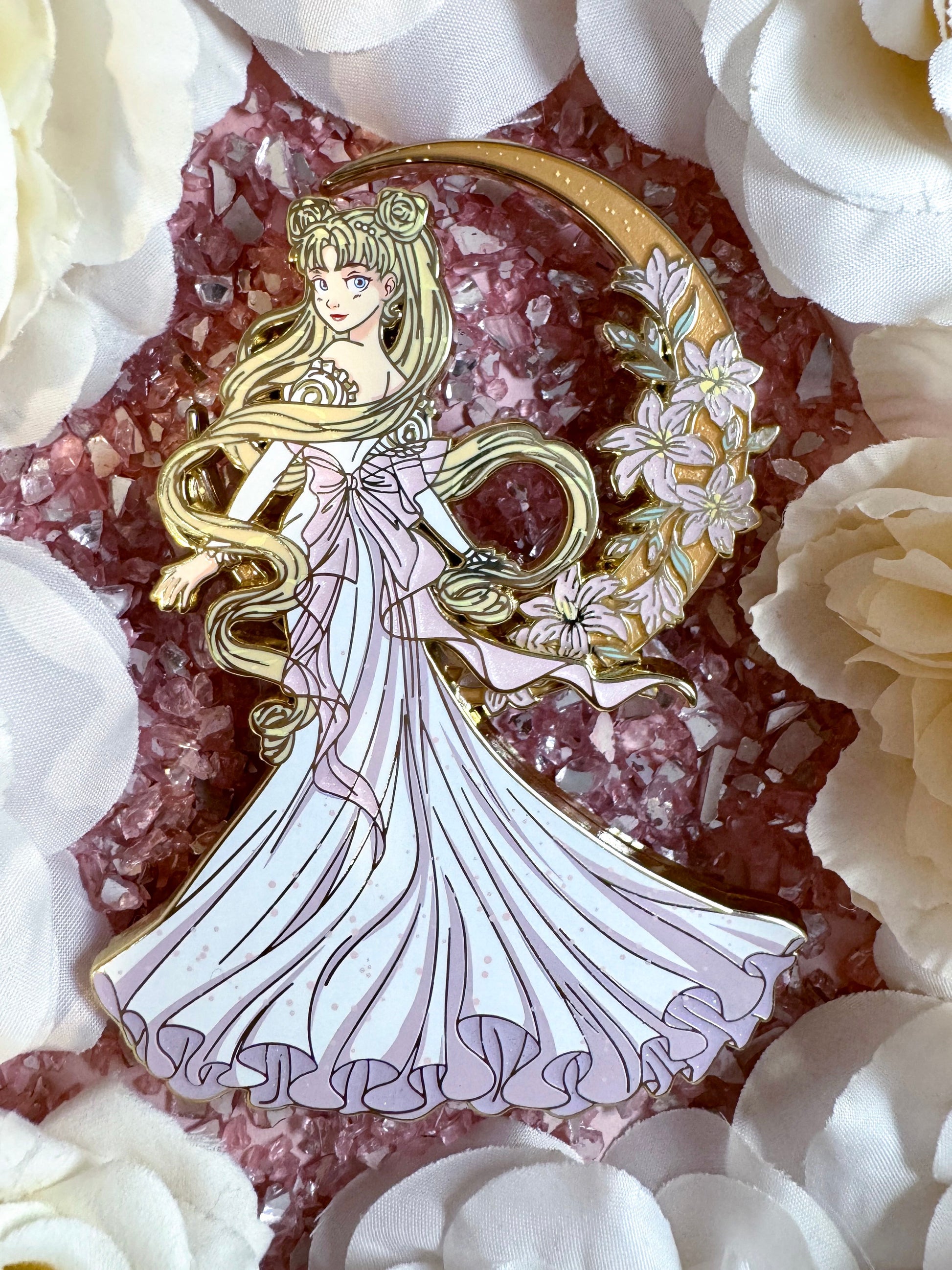 The backpin has a transparent sandblast moon with glitter flowers. Serenity has a glitter underskirt and a pearlescent bow.